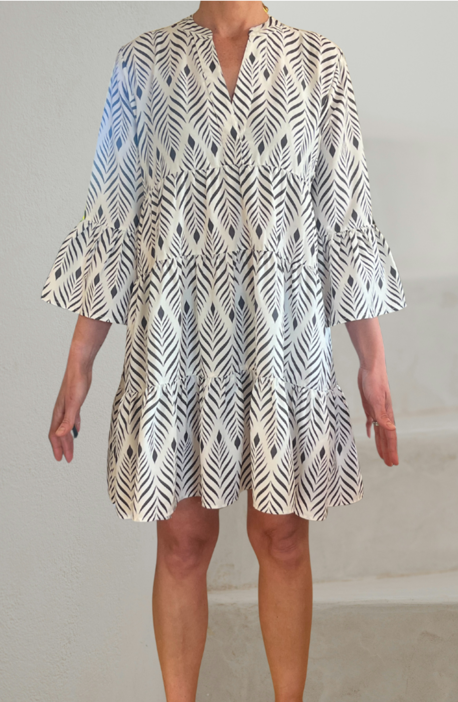 A striking black print over white floaty fabric adds a touch of style, perfect for chic summer vibes.