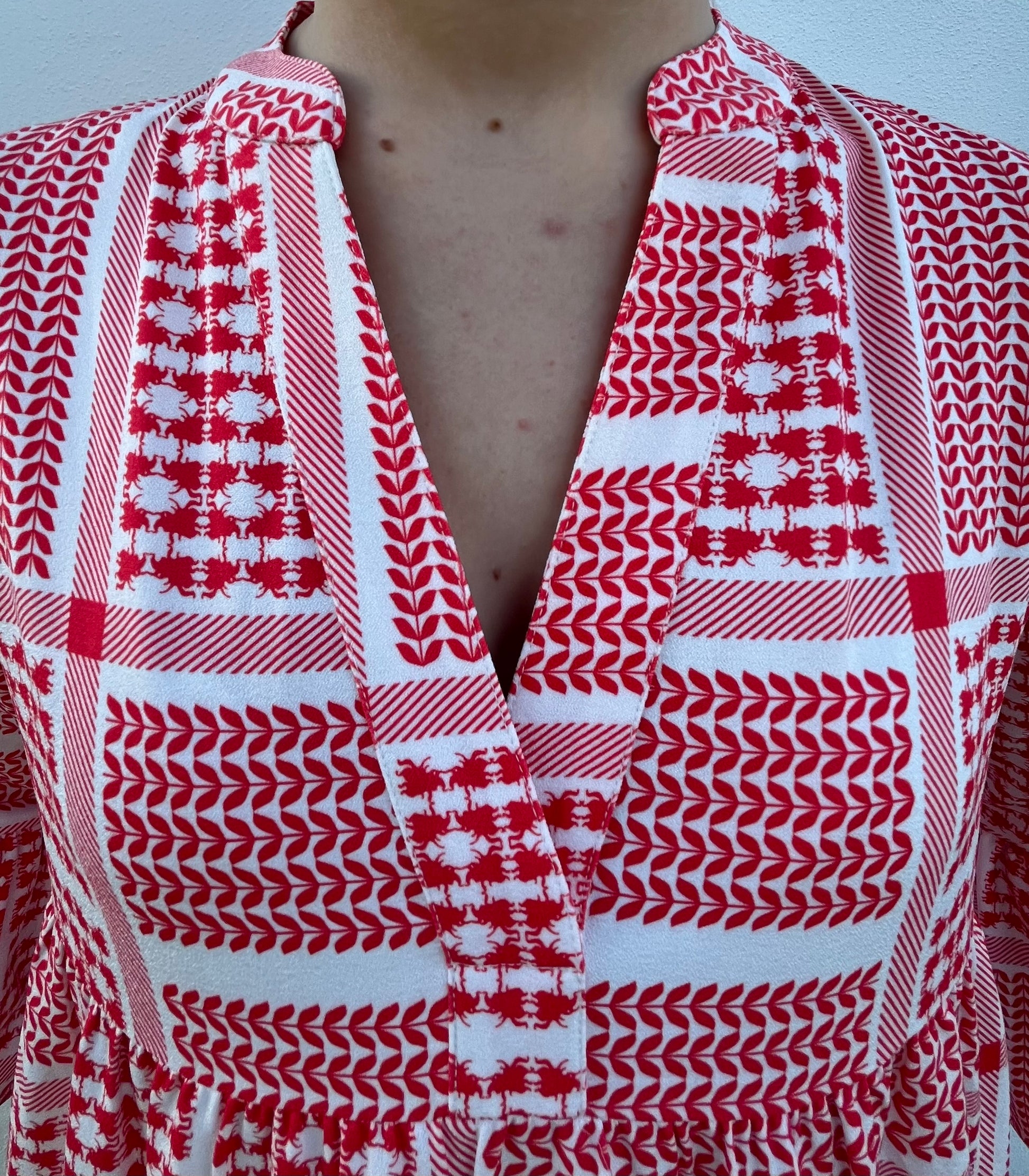 Ruffle dress with 3-tiers, mandarin collar opening into an elegant V neck with a 3/4 flounce sleeve.