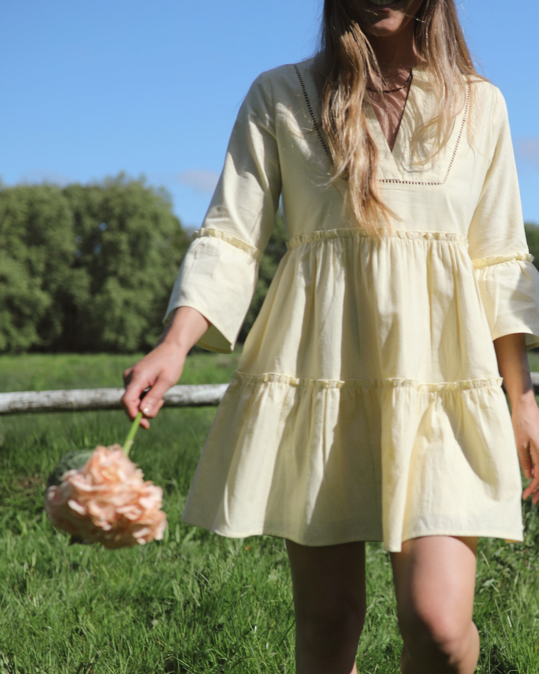 Featuring ruffled sleeves & a flowy tiered design, this piece is perfect for everything from picnics in the park to holiday adventures.